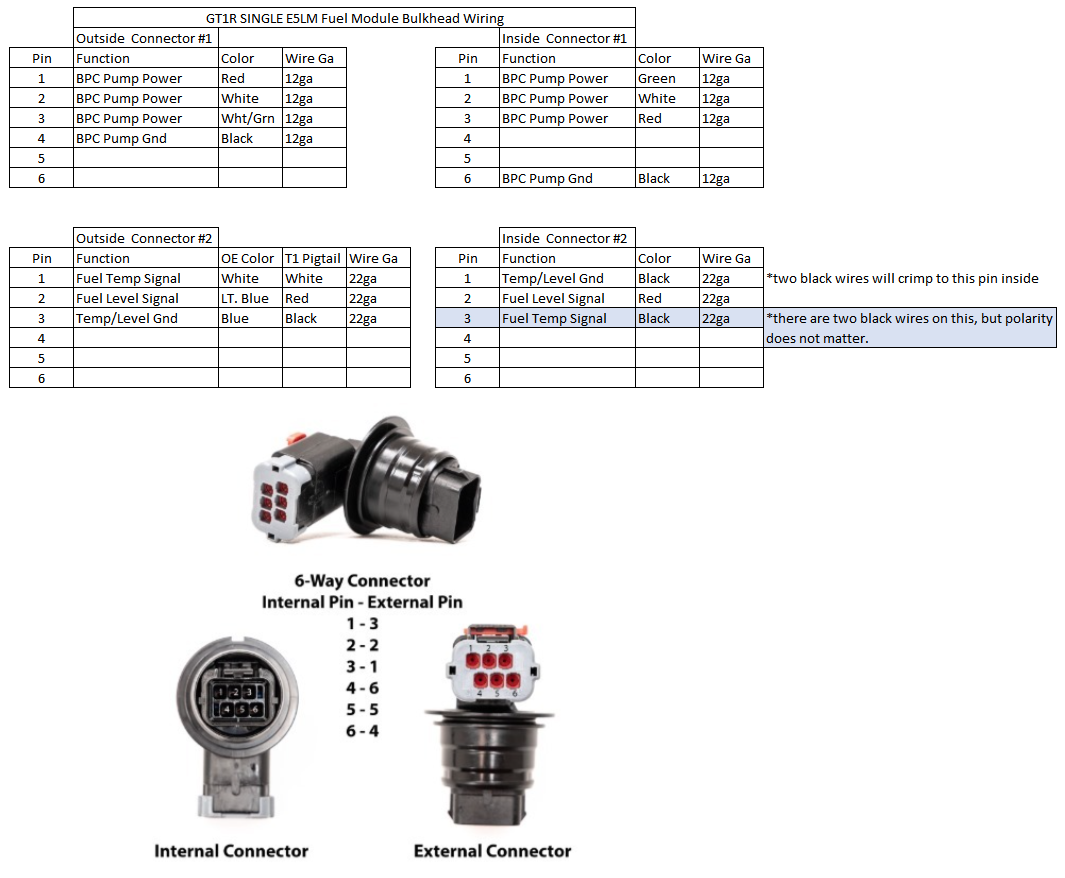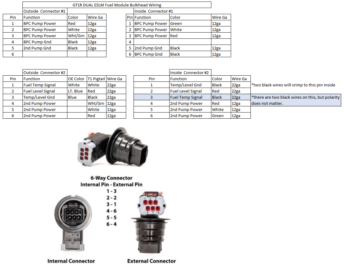 For a single pump, the fuel pump pigtail will be terminated to one of the two internal six pin connectors, and you will use two cavity plugs to occupy the two vacant holes on the external connector. For a dual pump setup, one more wire will be terminated and only one cavity plug will be used. More details on this can be found at the bottom of this installation manual along with the other wiring information.
