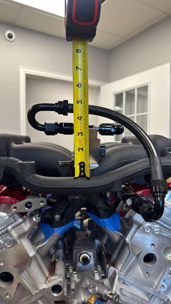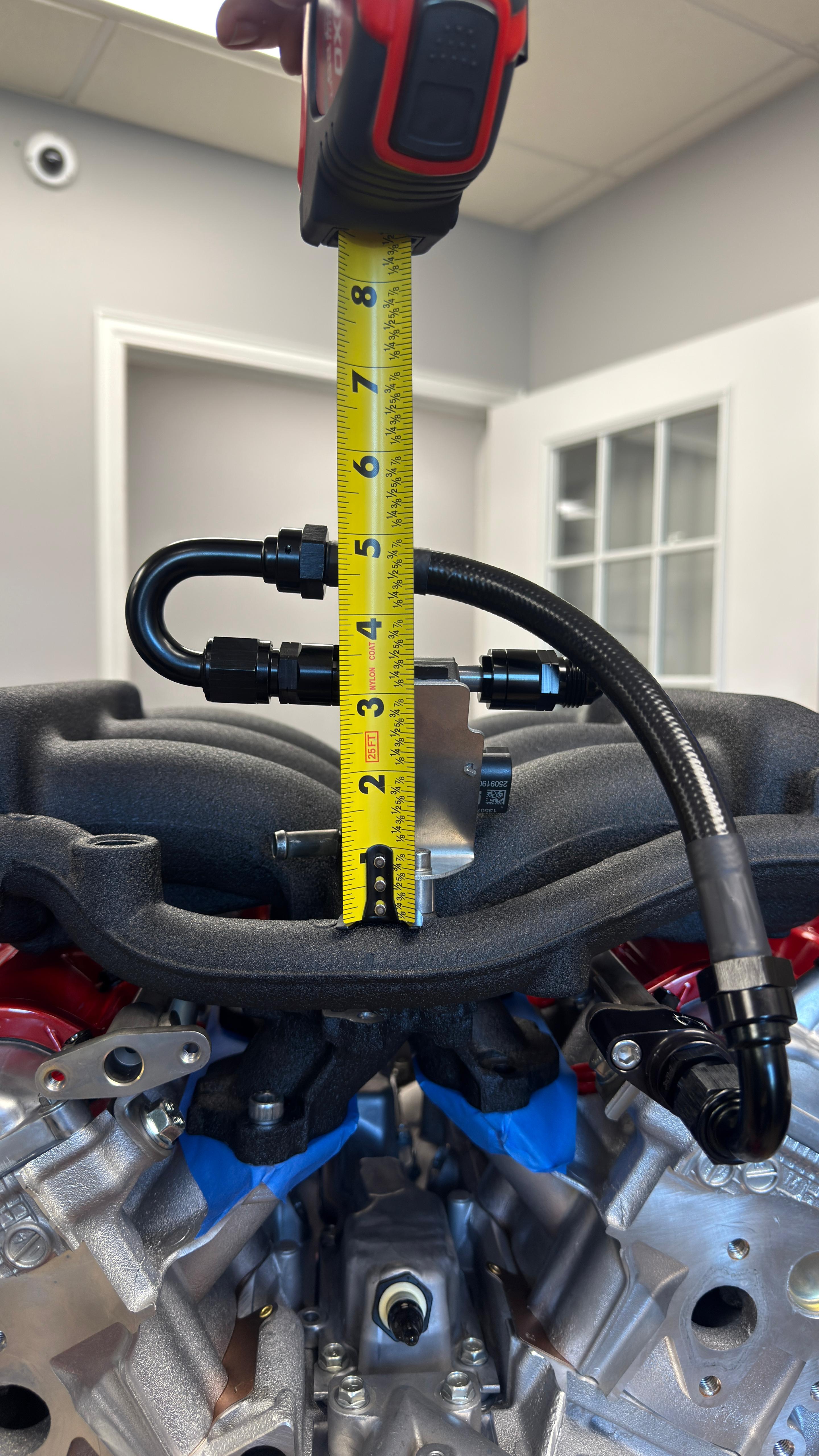 Worth noting is that the heigh of the 180° fitting in relation to the engine, for hood clearance, can be affected a notable amount by clocking the 90° fitting on the fuel rail. Rotating the 90° clockwise from the 12 o'clock position at this perspective will allow the 180° fitting to rotate towards the back of the engine and shorten the install height. Going counter-clockwise from 12 o'clock will allow it to gain height, and likely will hit the hood. The two assemblies below are just hand assembled, but you can see with even a slight rotation over a 1/4" of height can be gained/reduced. If necessary, the 90° can easily be rotated even further:
