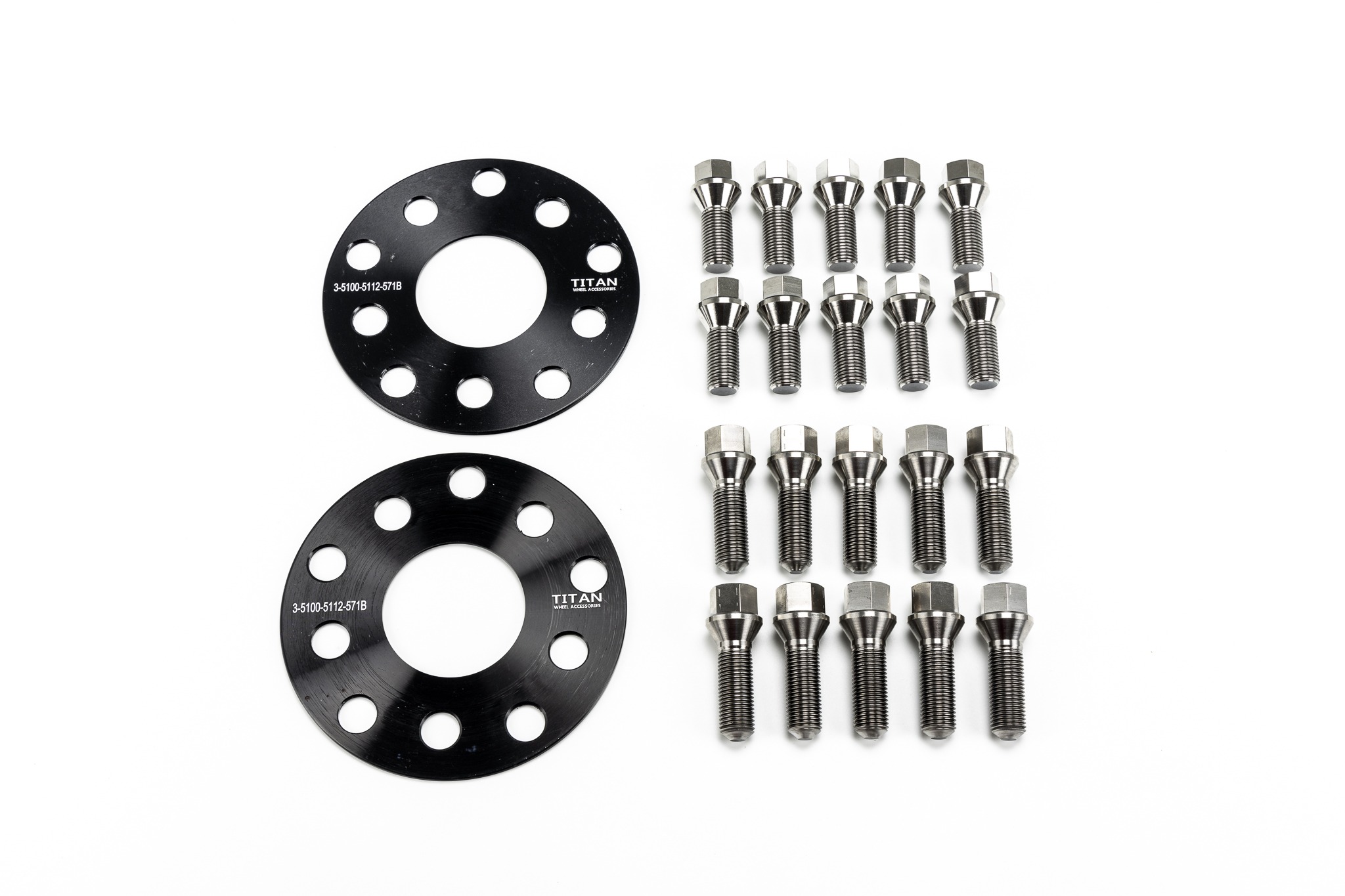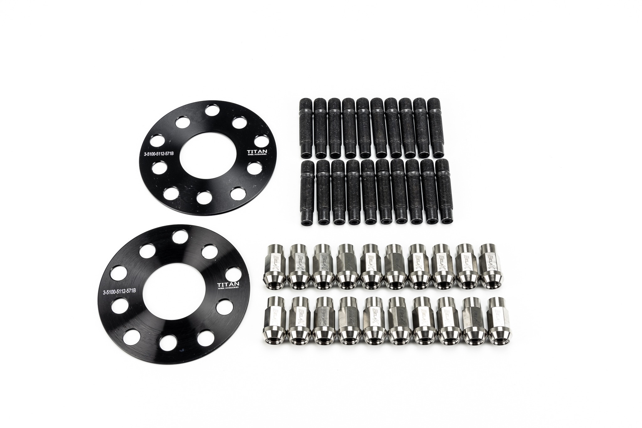 There are two different stud/bolt setups that are sent depending on the wheels you have purchased. The first option is the titanium lug bolt setup which comes with 10 49mm bolts and 10 60mm bolts. The longer 60mm bolts will be used on the front wheels, and the shorter 49mm bolts will be used on the rear wheels. It is recommended to apply anti-seize to the threads of the bolts before installing to prevent galling. Once installed torque the lug bolts to 90ft/lbs.